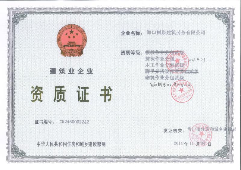 海口樹泉建筑勞務有限公司成立于2011年,公司位于??冢淝吧硎且患覍I建筑施工隊,自2004年即開始在海南從事建筑勞務施工。自成立至今,公司已經擁有一支科學管理、質量過硬、能打硬仗,搶工期的專業隊伍。能獨立承擔大中型工業與民用建筑 、室內外裝修、各類機電設備安裝工程。代表工程有??跒I海華庭、三亞時代海岸T01/02/04/05棟高層、合肥東海花園二期、陵水富力灣B區高層、三亞金中海(酒店)、瓊海大印經典花園、海口環球海景大酒店(四星級酒店,在建中)、陵水珍珠大廈(五星酒店)、??谌f達廣場、美蘭機場二期。